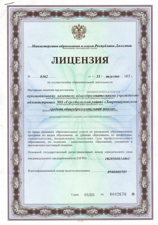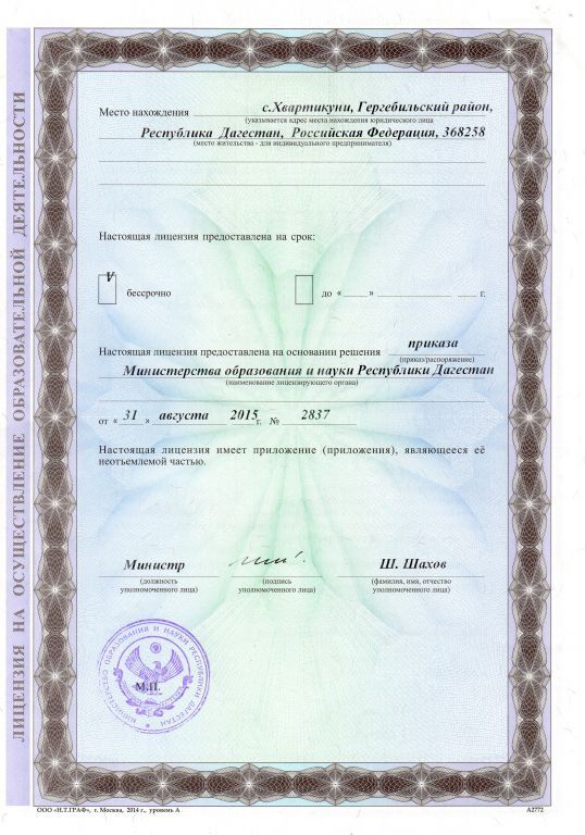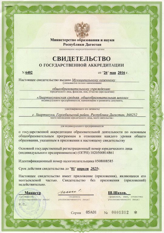 Адрес местонахождения образовательной организации* 368258 Республика Дагестан Гергебильский район село Хвартикуни ул. школьная №5